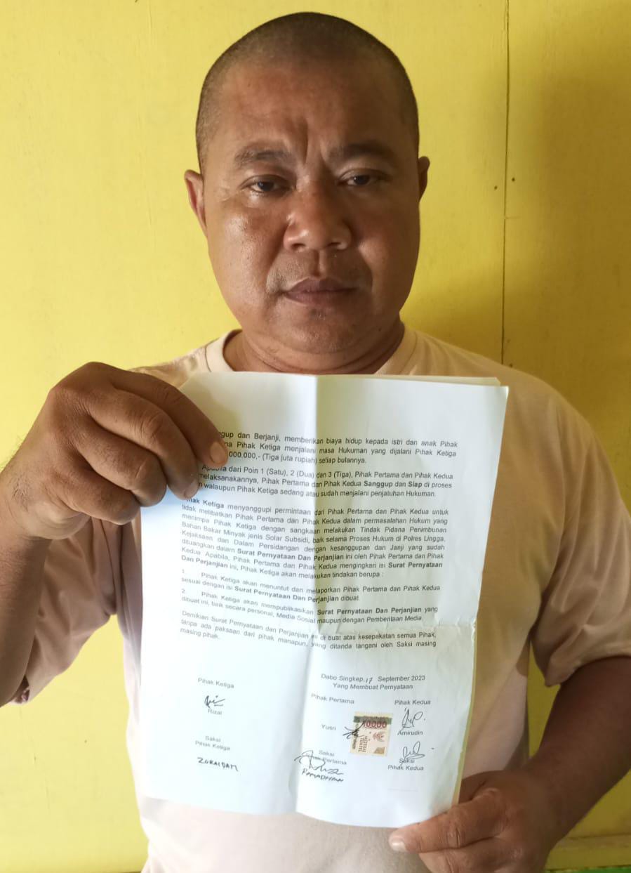 Infolingga.com, Lingga – Dua warga Dabo Singkep, Yusri dan Amirudin, terancam berurusan dengan hukum setelah diduga mengingkari perjanjian tertulis dengan Rizal, eks terpidana kasus penimbunan BBM subsidi jenis solar yang terjadi di Desa Rejai, Kecamatan Bakung Serumpun, tahun 2023 lalu.